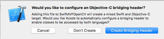 このあと「SwiftとObjective-Cをブリッジ(橋渡し)するHeaderを作るか」と確認を求められるので "Create Bridging Header" を選択します。 ブリッジングヘッダーファイルの名前は「プロジェクト名-Bridging-Header.h」となります。