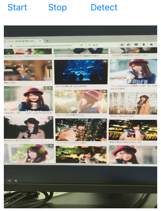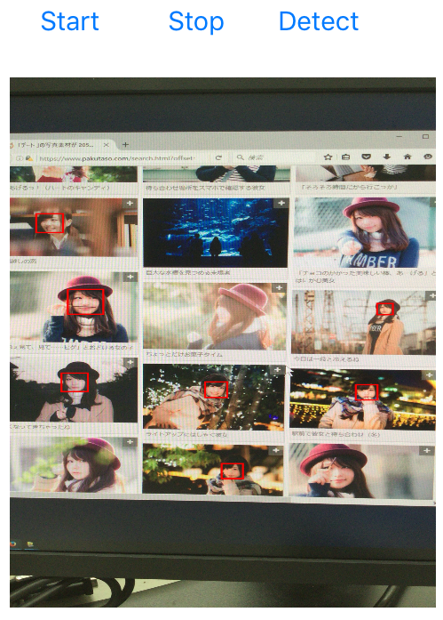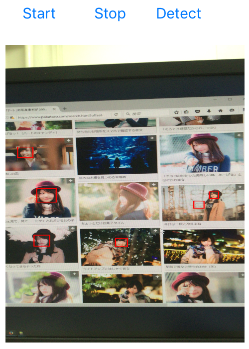 下に実行画面を示します。 左は Start ボタンをタップして画像のキャプチャを始めた画面です。 真ん中は Detect ボタンをタップして認識を開始した画面で、顔が7個認識されています。 右の画面では顔が6個認識されていますが、うち1個は誤認識です。
