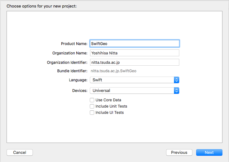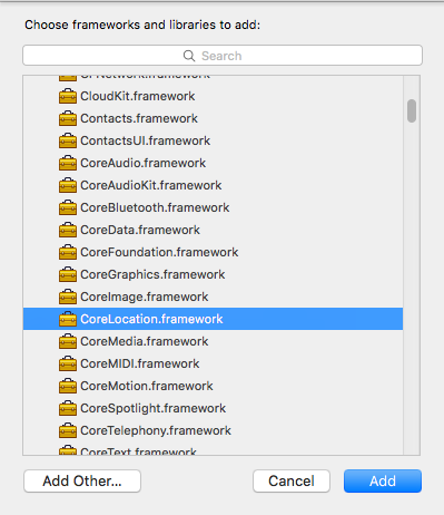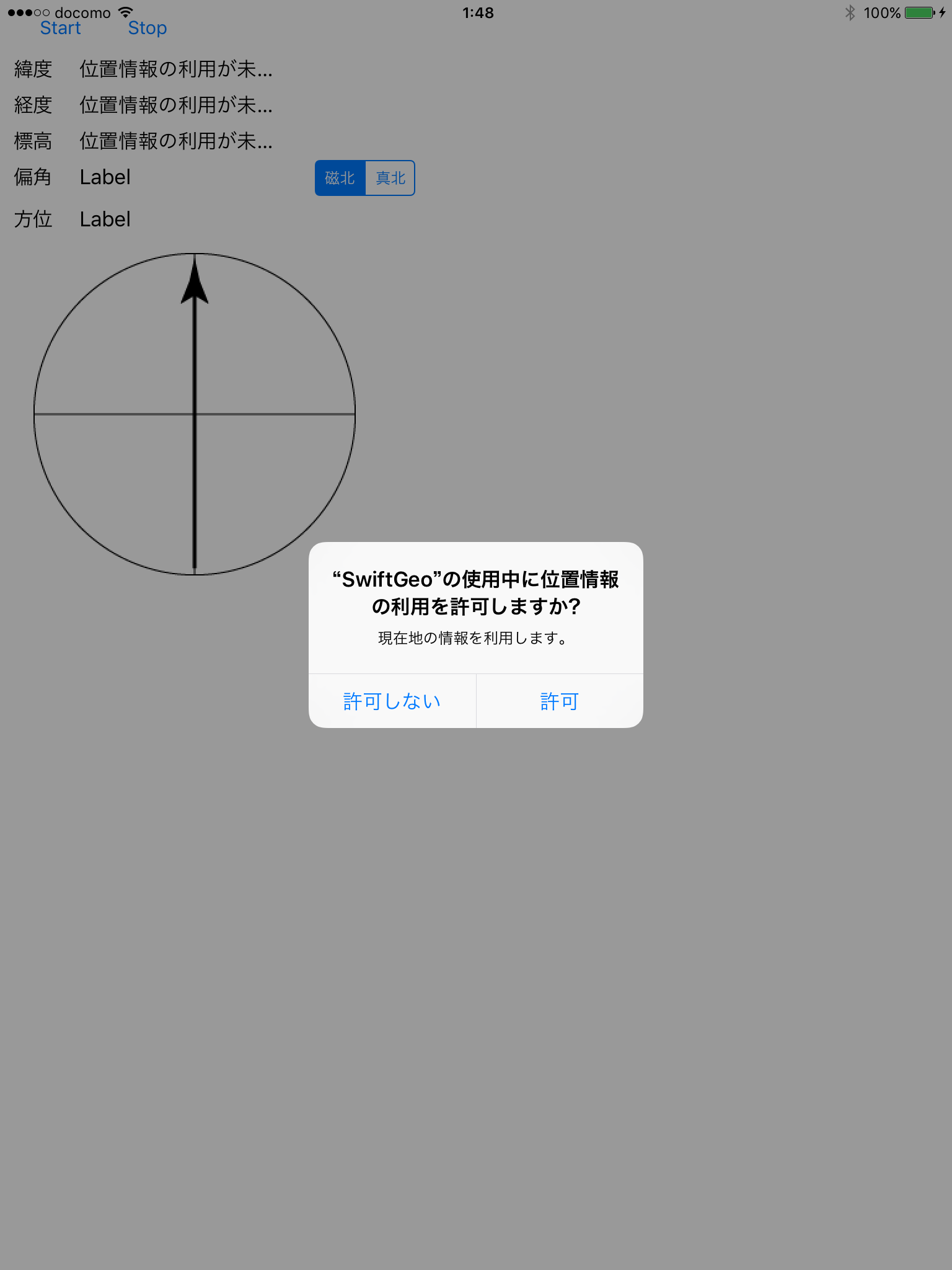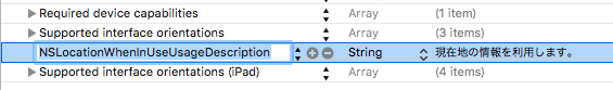 Key: NSLocationWhenInUseUsageDescription Type: String Value: 現在地の情報を利用します。を追加します。 ここに追加した説明は、「許可を求める確認ダイアログ」や 「設定 -> プライバシー -> 位置情報サービスのアプリ設定」 で表示されます。