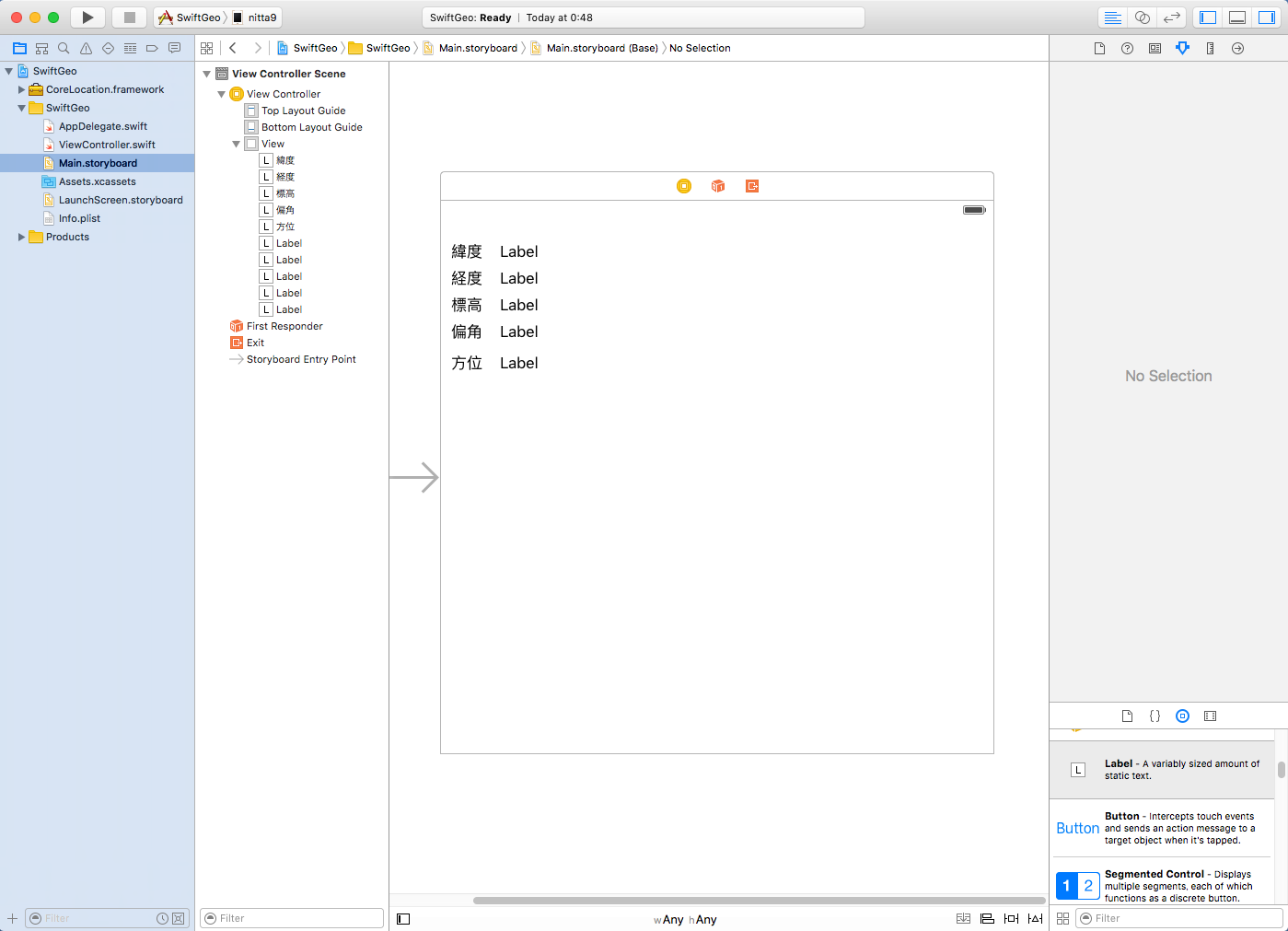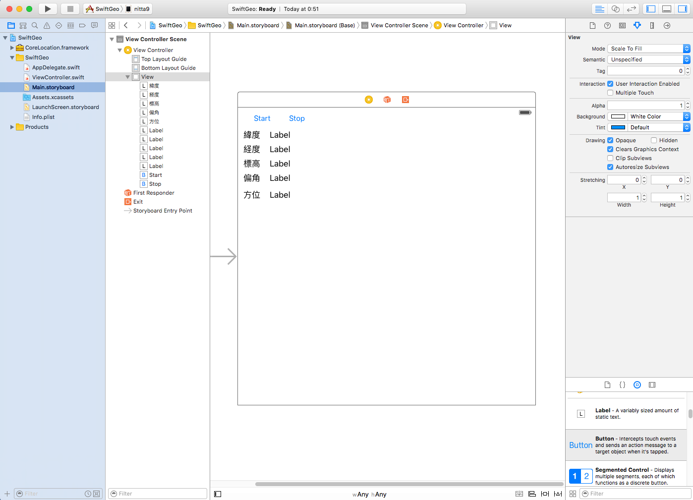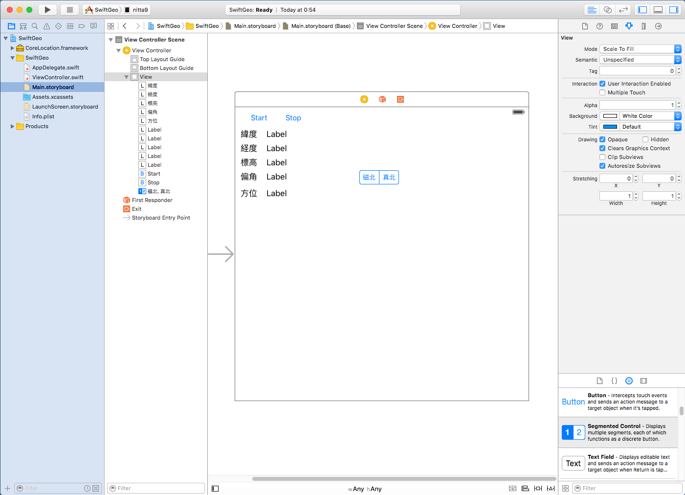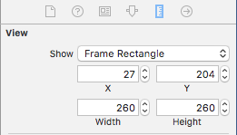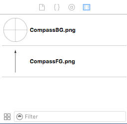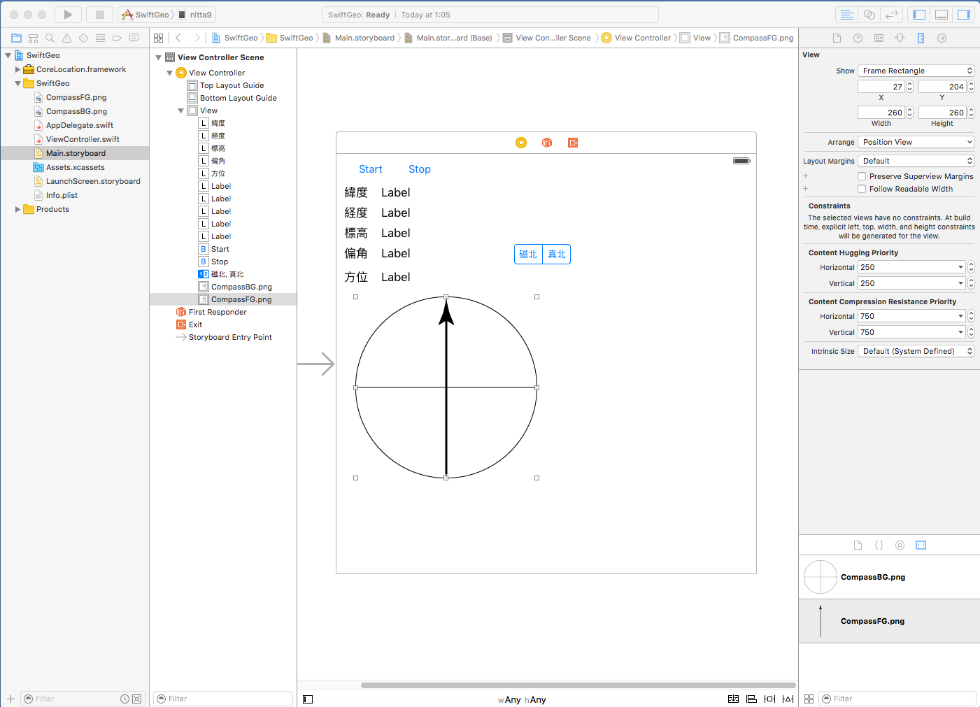 Main.storyboard上の画面に CompassBG.png, CompassFG.png の順でドラッグして重なるように配置します。 配置する位置は、後からウィンドウ右上の Size Inspector の View の X, Y で位置を調整できます。