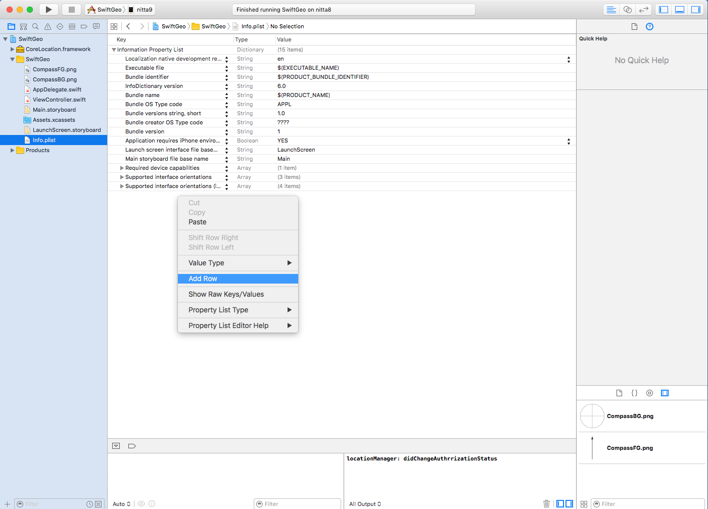 info.plist を表示した状態で、右クリックし"Add row" を選択し、