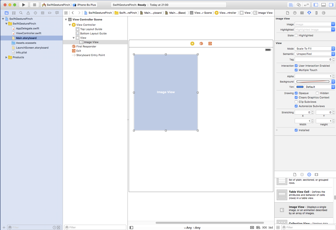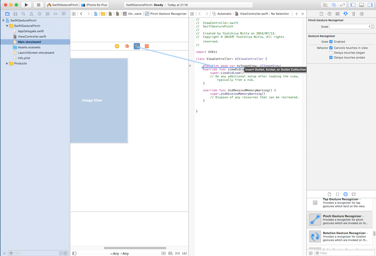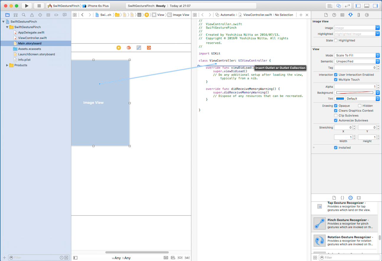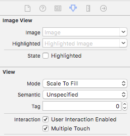 ImageViewはデフォルトではジェスチャを認識しないように設定されていますので、 ジェスチャを認識するように変更(User Interaction Enabled, Multiple Touch をともにチェック)します。
