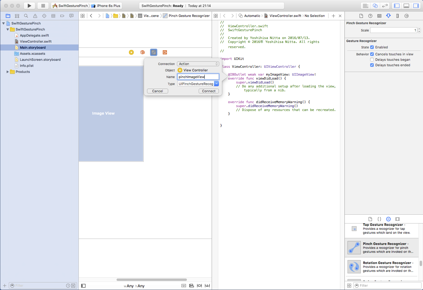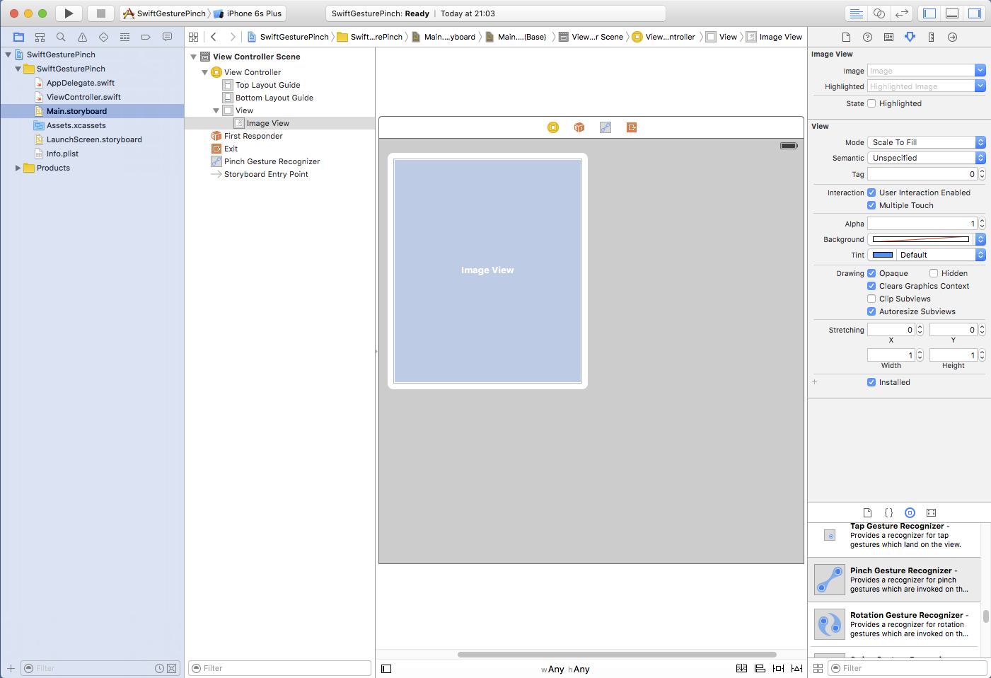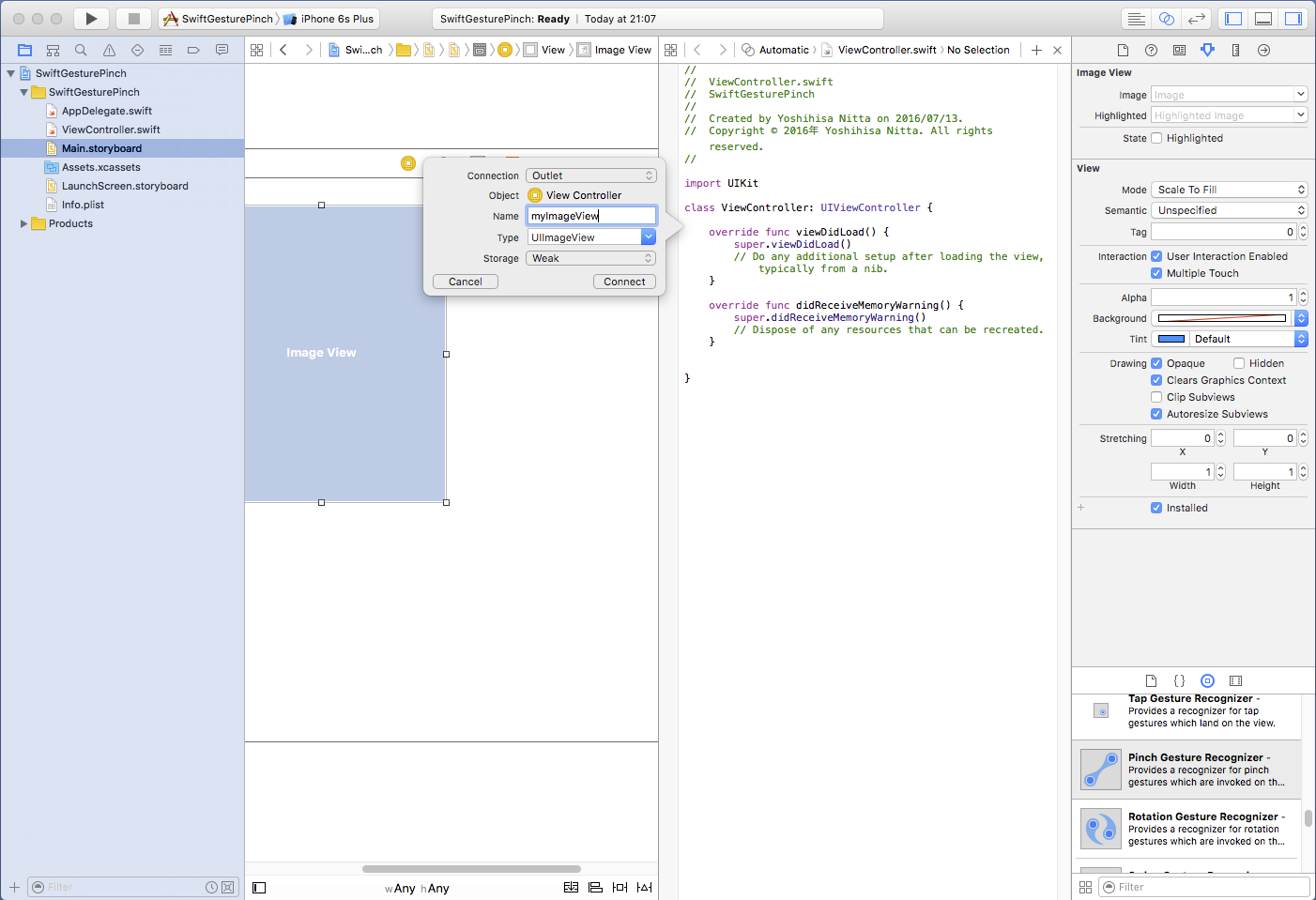 ImageViewはデフォルトではジェスチャを認識しないように設定されていますので、 ジェスチャを認識するように変更(User Interaction Enabled, Multiple Touch をともにチェック)します。