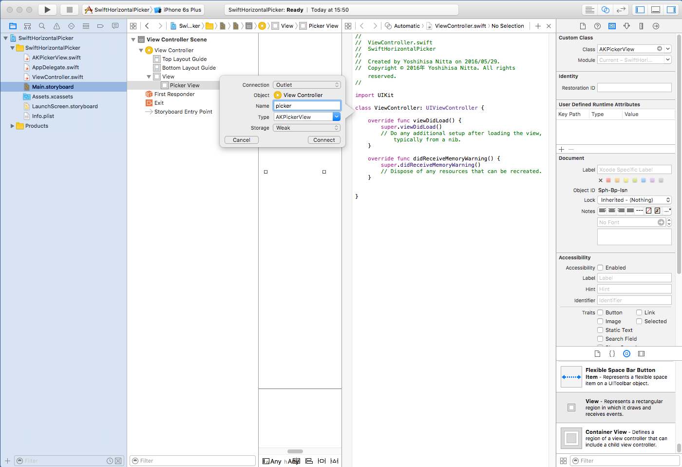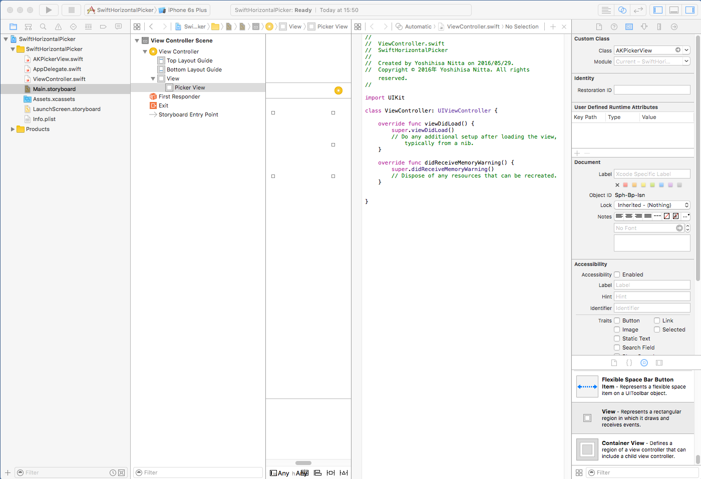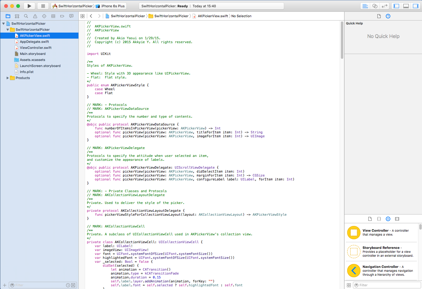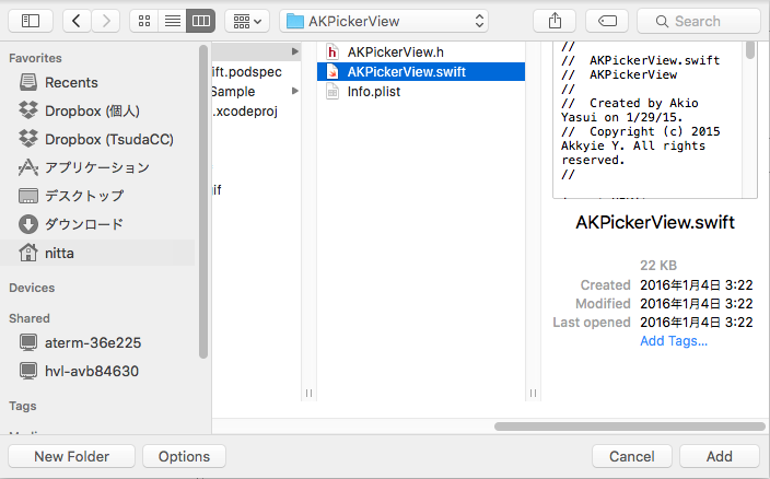 ダウンロードした "AKPickerView.swift" を選択して "Add" ボタンをクリックすると、ファイルがプロジェクトに追加されます。 このときOptionsをクリックして、"Destination: [ ] Copy items if needed" にチェックをつけておくこと(重要)。