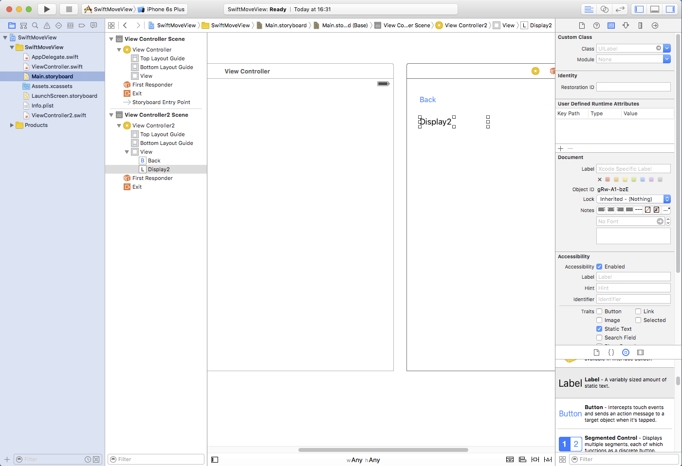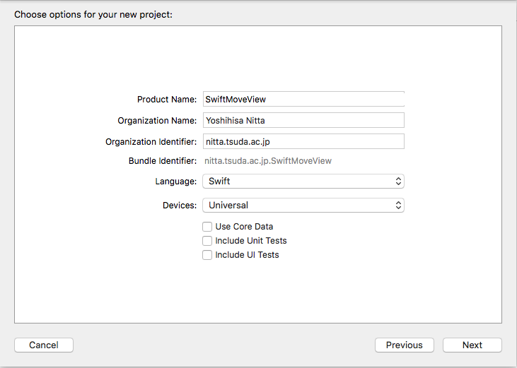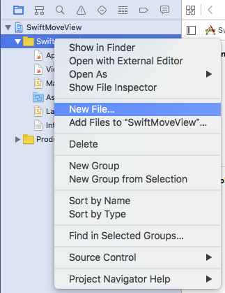 project navigator のプロジェクト名の上でマウスを右ドラッグして "New File..." を選択します。 iOS の Source で Cocoa Touch Class を選んで Next をクリックします。 Class: には "ViewController2", Subclass of: には "UIViewController" Language: には "Swift" を選びます(クラス名は自由に選んで構いません)。 ViewController2.swift がプロジェクトに追加されます。