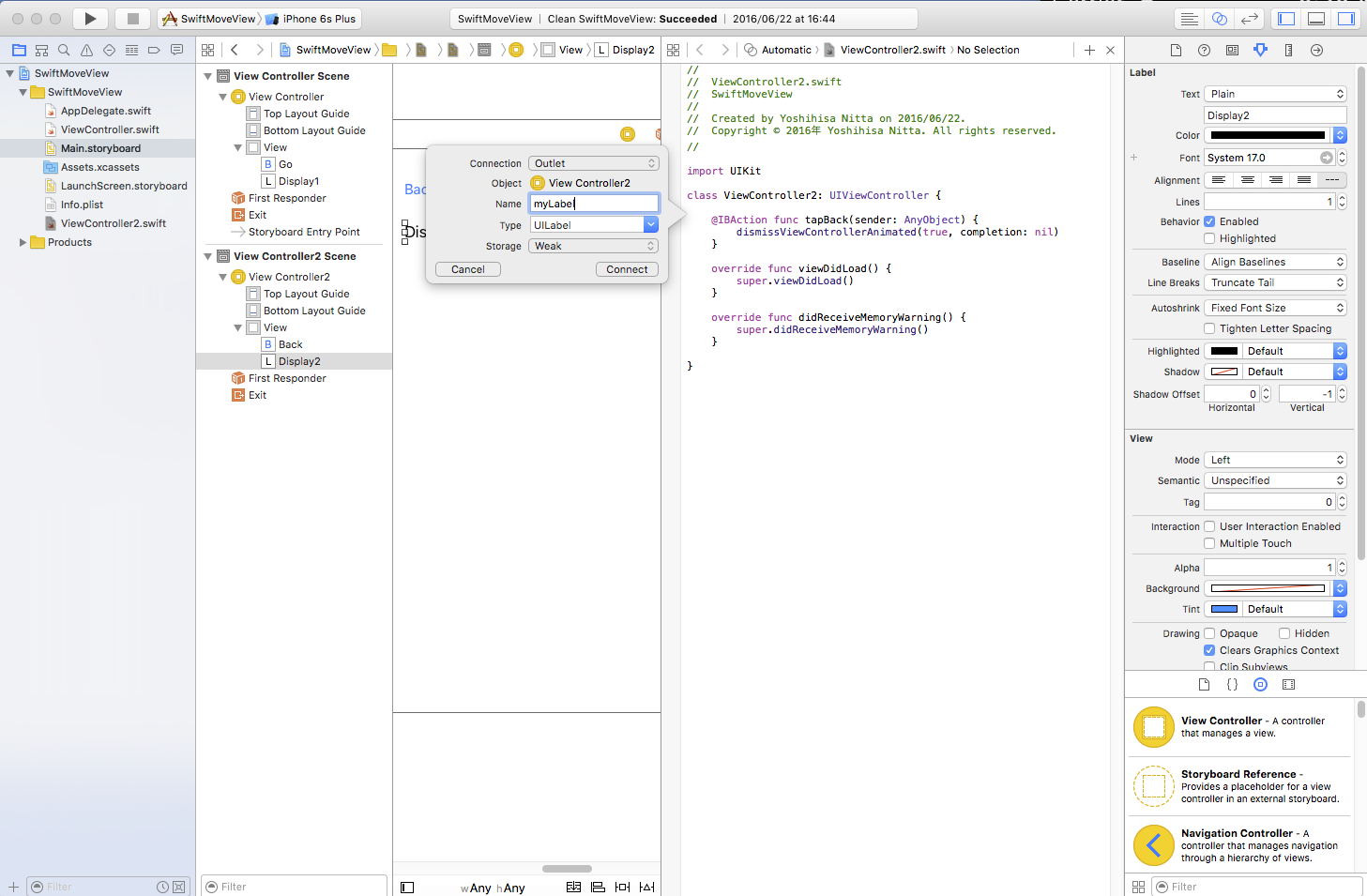 この段階では遷移先のUIViewControllerではUIView をスーパークラスに持つインスタンスはまだ用意されていないので、 アクセスしても nil であることに注意しましょう。代入などしてはいけません(下の例では実行時エラーになる例をコメントにしてあります)。 下の例では、passedString というString型の変数に代入しています。