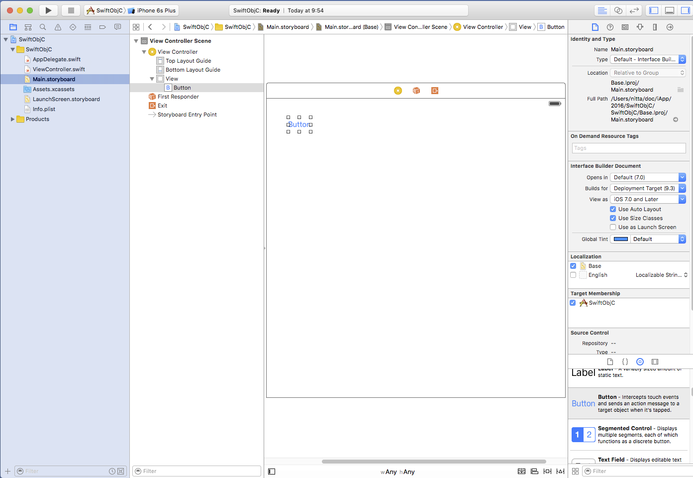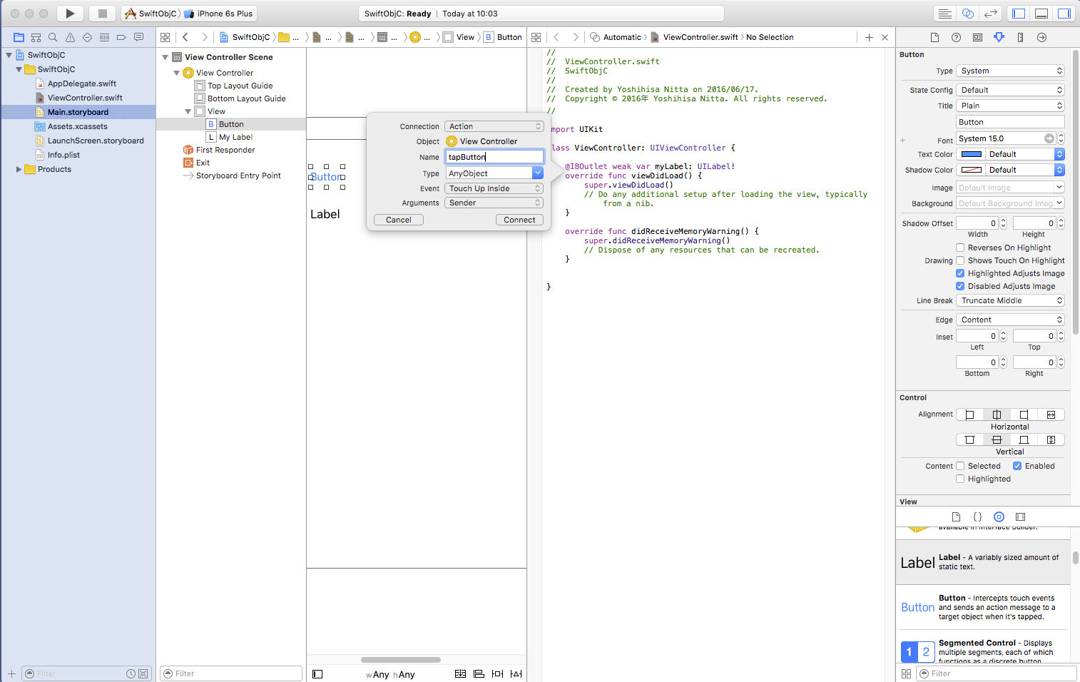 @IBOutlet weak var myLabel: UILabel!の下の行まで持っていきます。 ConnectionはAction, Name は tapButton として Connect をクリックしましょう。