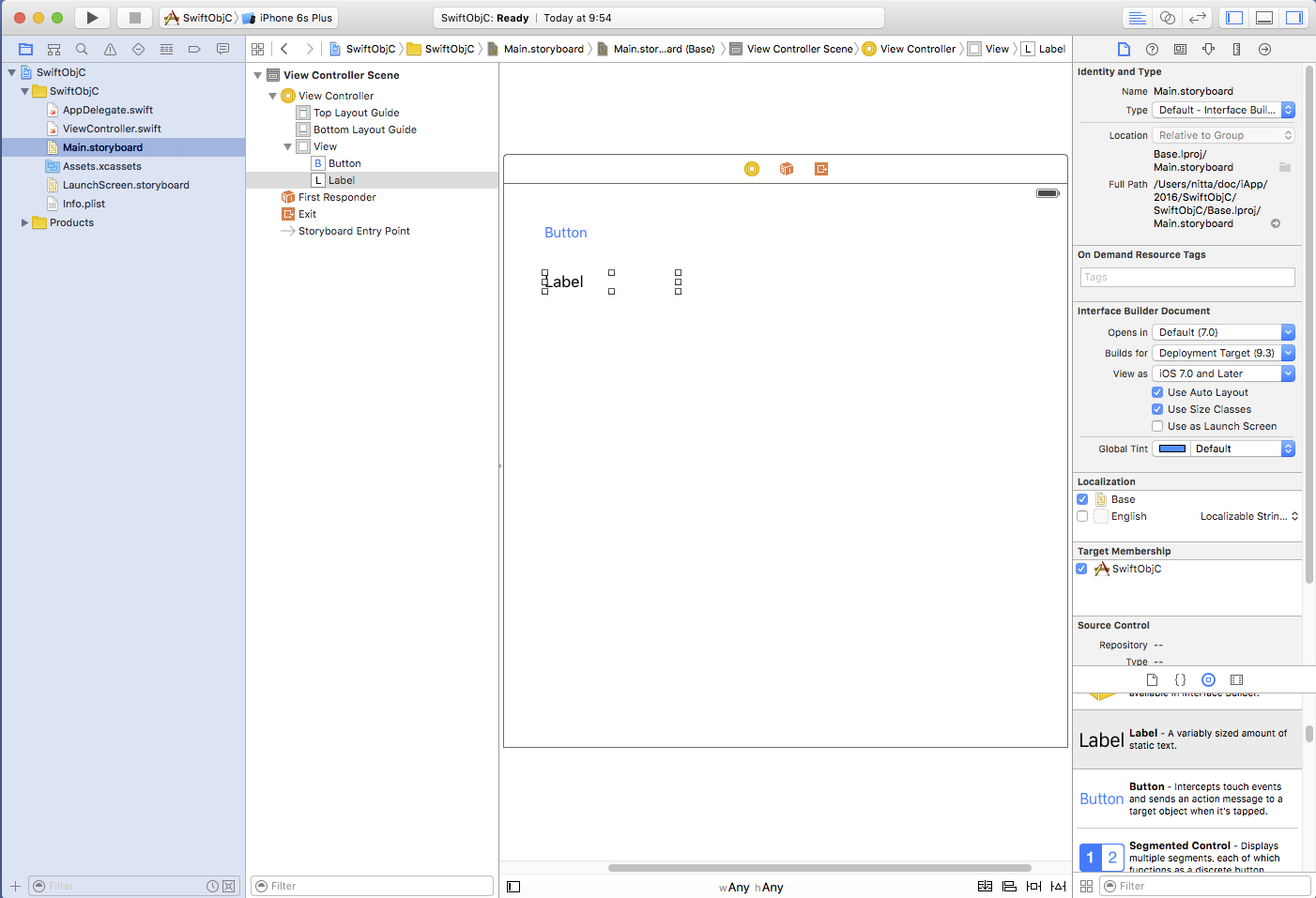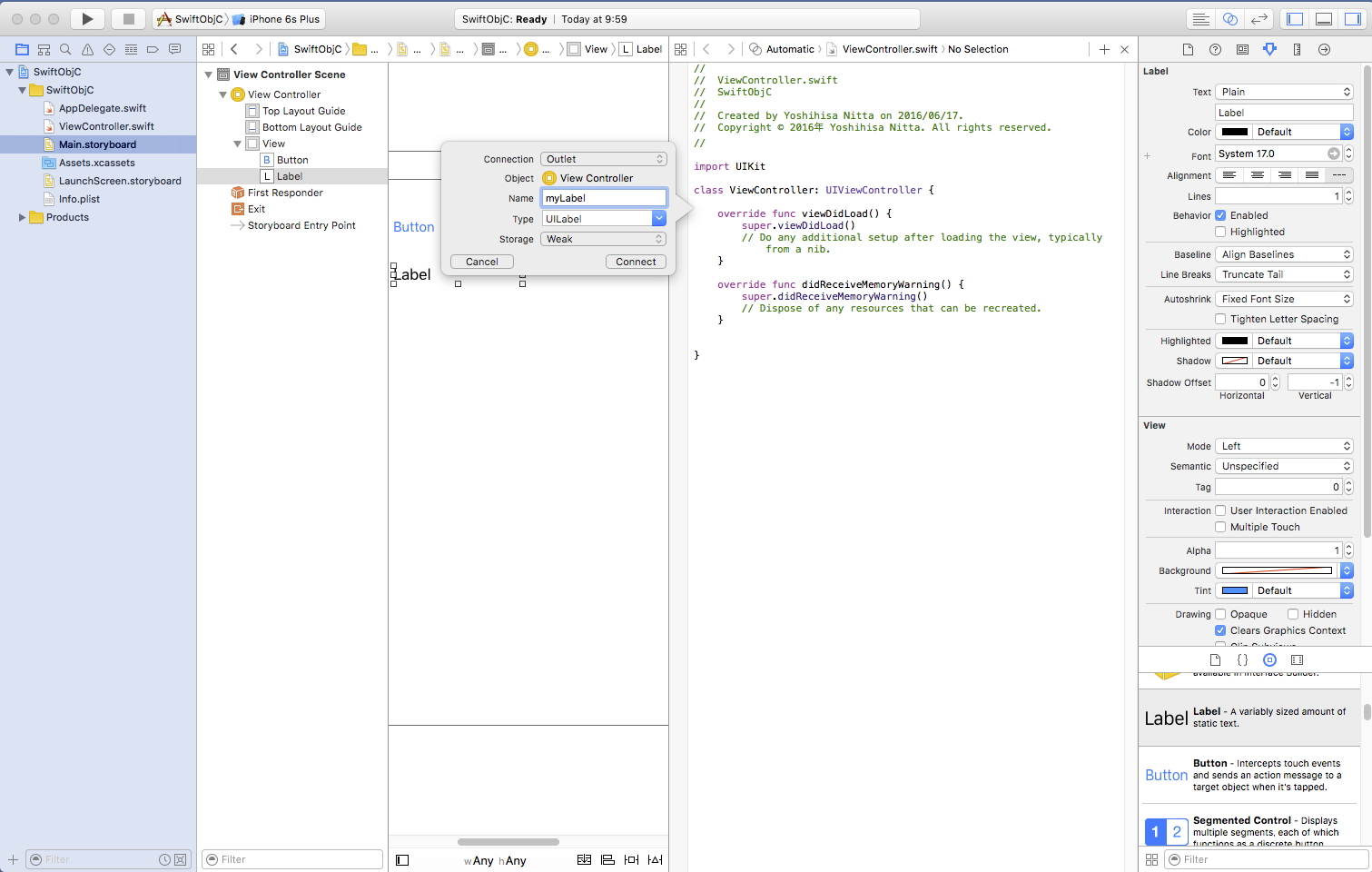 ConnectionはOutlet, Name は myLabel として Connect をクリックしましょう。