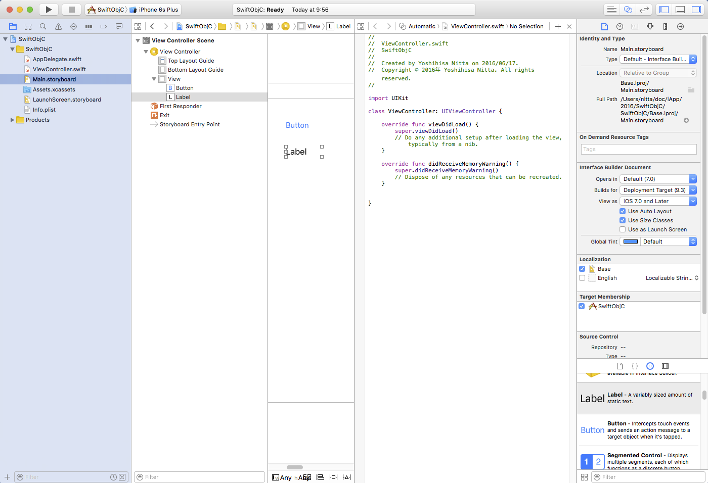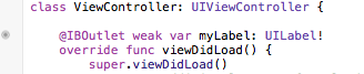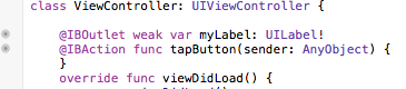 @IBOutlet weak var myLabel: UILabel!という行が追加されました。その行の左には丸が表示されていますが、これをクリックすると 何のオブジェクトと結び付いているかわかります。