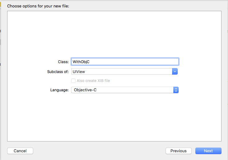 iOS -> Cocoa Touch Class -> Next を選ぶとクラス名の入力になります。ここではクラス名は WithObjC、Subclass ofに UIView, LauguageにObjective-C を選択しました。 もしも表示に関係しないならばSubclass ofはNSObjectでもよいと思われます。