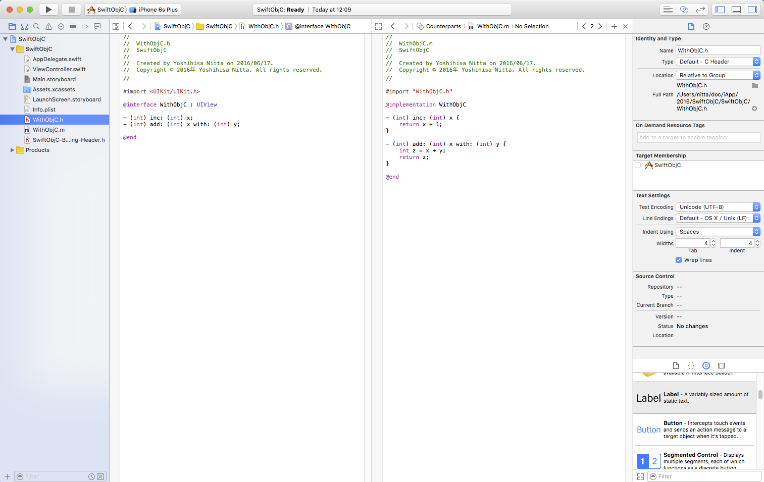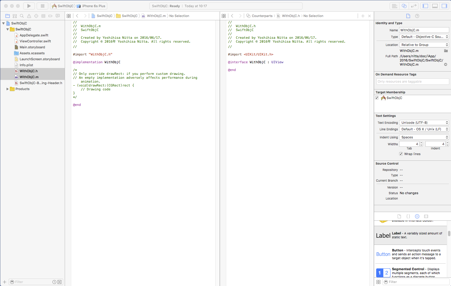 WithObjC.h, WithObjC.m, SwiftObjC-Bridging-Header.h が新たに生成されました。