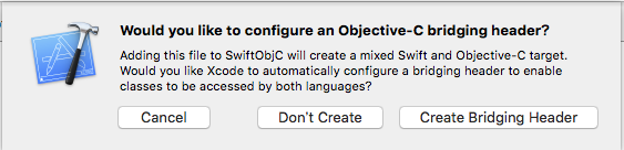 このあと「SwiftとObjective-Cをブリッジ(橋渡し)するHeaderを作るか」と確認を求められるので "Create Bridging Header" を選択します。 ブリッジングヘッダーファイルの名前は「プロジェクト名-Bridging-Header.h」となります。