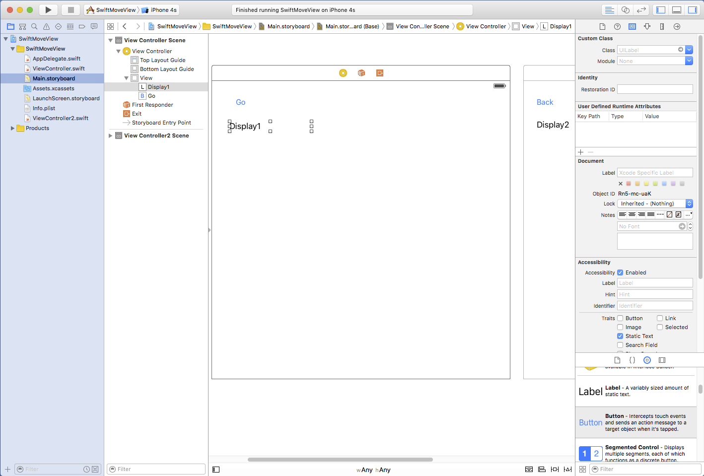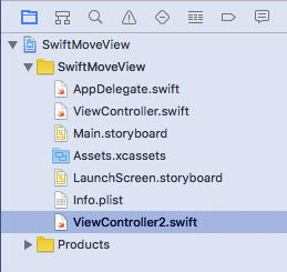 project navigator のプロジェクト名の上でマウスを右ドラッグして "New File..." を選択します。 iOS の Source で Cocoa Touch Class を選んで Next をクリックします。 Class: には "ViewController2", Subclass of: には "UIViewController" Language: には "Swift" を選びます(クラス名は自由に選んで構いません)。 ViewController2.swift がプロジェクトに追加されます。