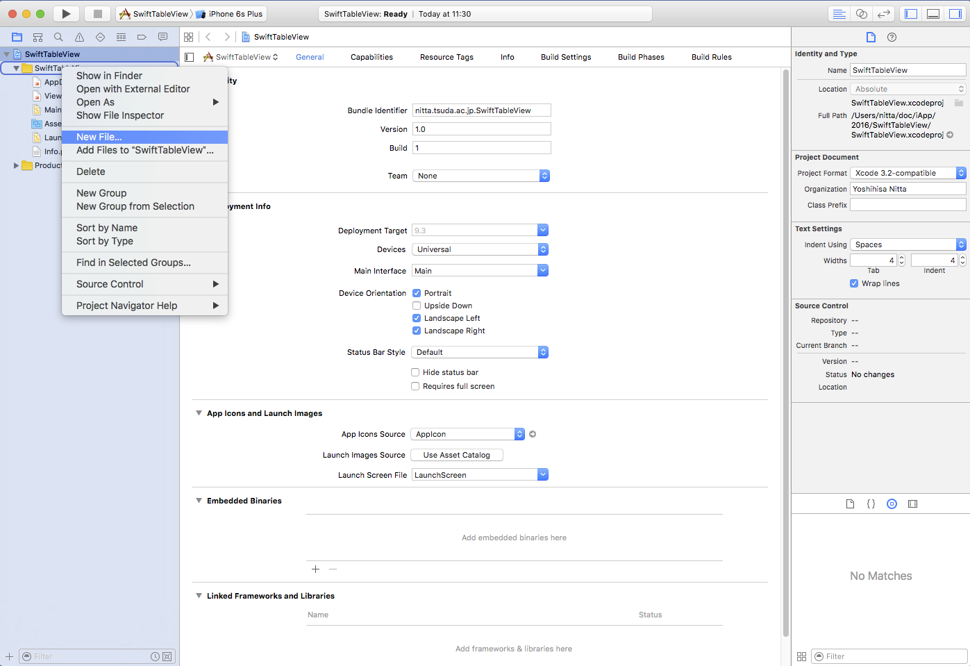 project navigator のプロジェクト名の上でマウスを右ドラッグして "New File..." を選択します。 iOS の Source で Cocoa Touch Class を選んで Next をクリックします。 Class: には "ViewController2", Subclass of: には "UIViewController" Language: には "Swift" を選びます(クラス名は自由に選んで構いません)。 ViewController2.swift がプロジェクトに追加されます。