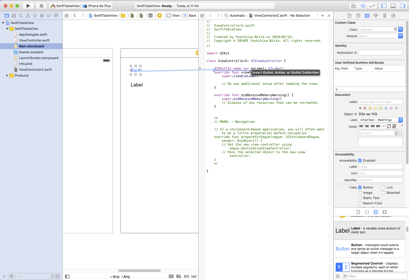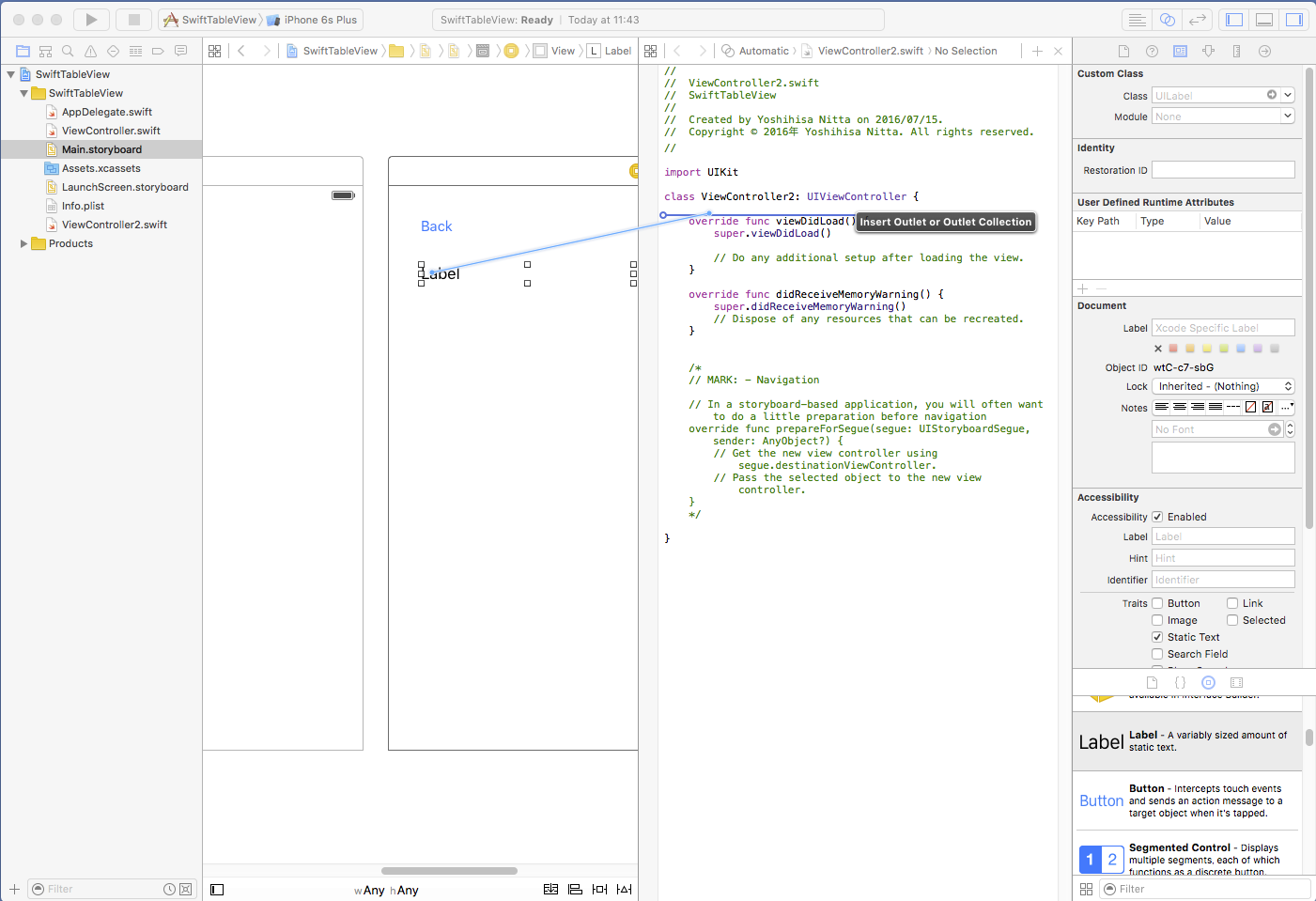 | "Back" Button | Action (Touch Up Inside) | tapBack()関数 |