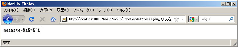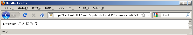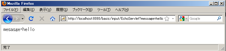 http://localhost:8080/basic/input/EchoServlet?message=goodmorning にアクセスをしてみましょう。 ただしくEchoServletで処理されてmessage="与えたデータ"が表示されると思います。