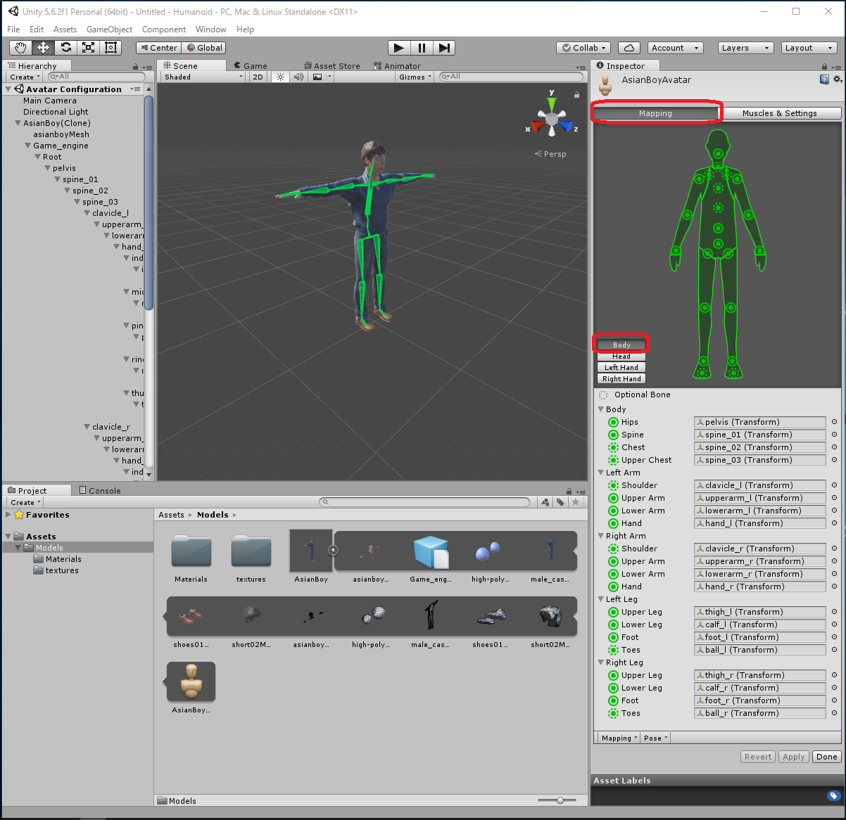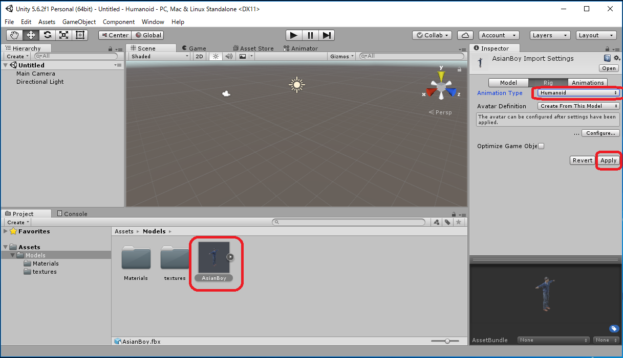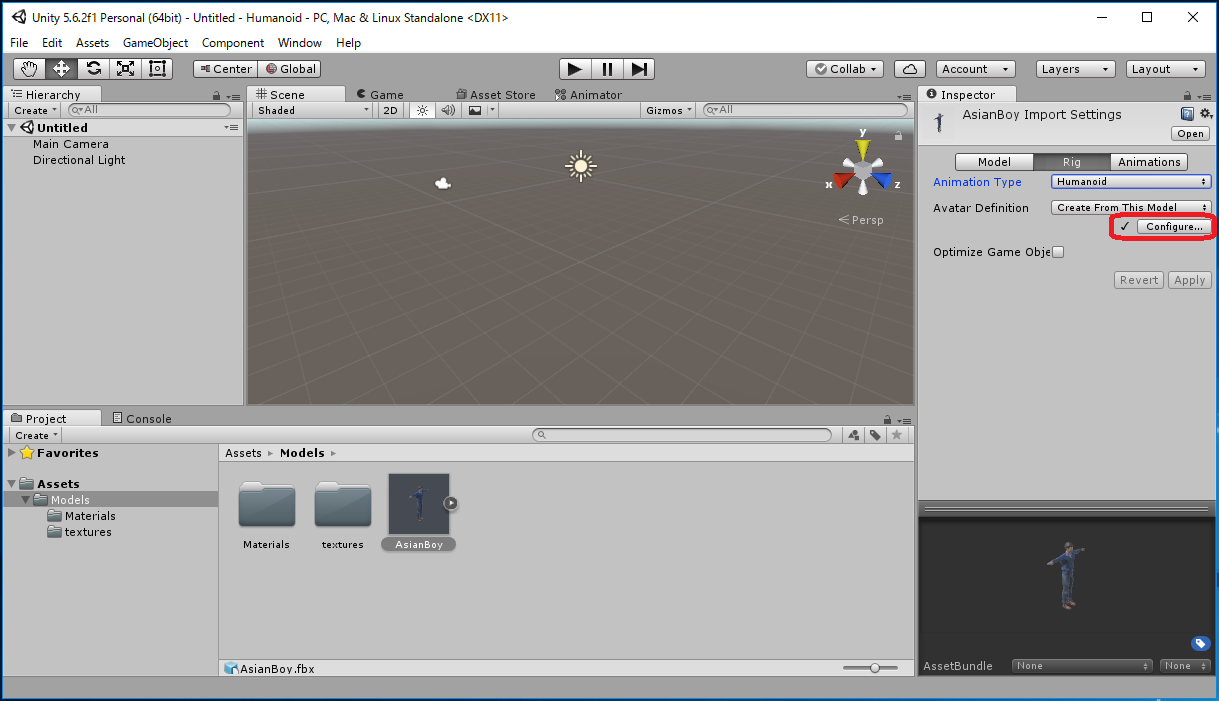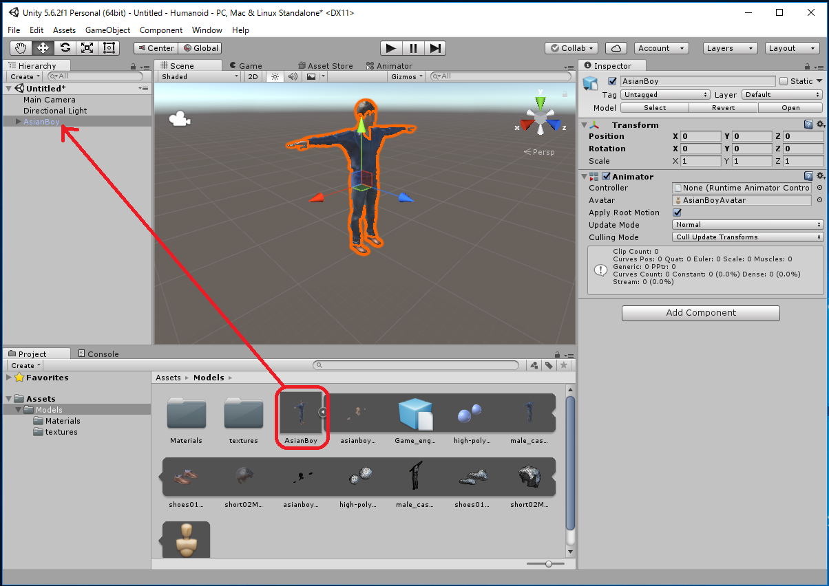 Assets -> Import New Asset... -> AsianBody.fbxから行なってもよいのですが、これだとAsianBoy.fbx に必要なtextureが 自動ではimportされず、モデルが真っ白になってしまいます。 この場合は Assets/Models/Materials/に生成された白いMaterialに対応する Textureを手動でimportしなくてはいけません。