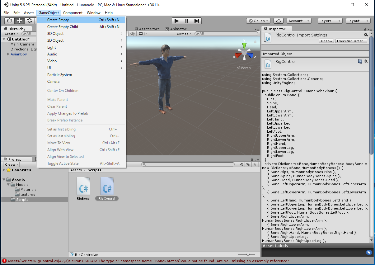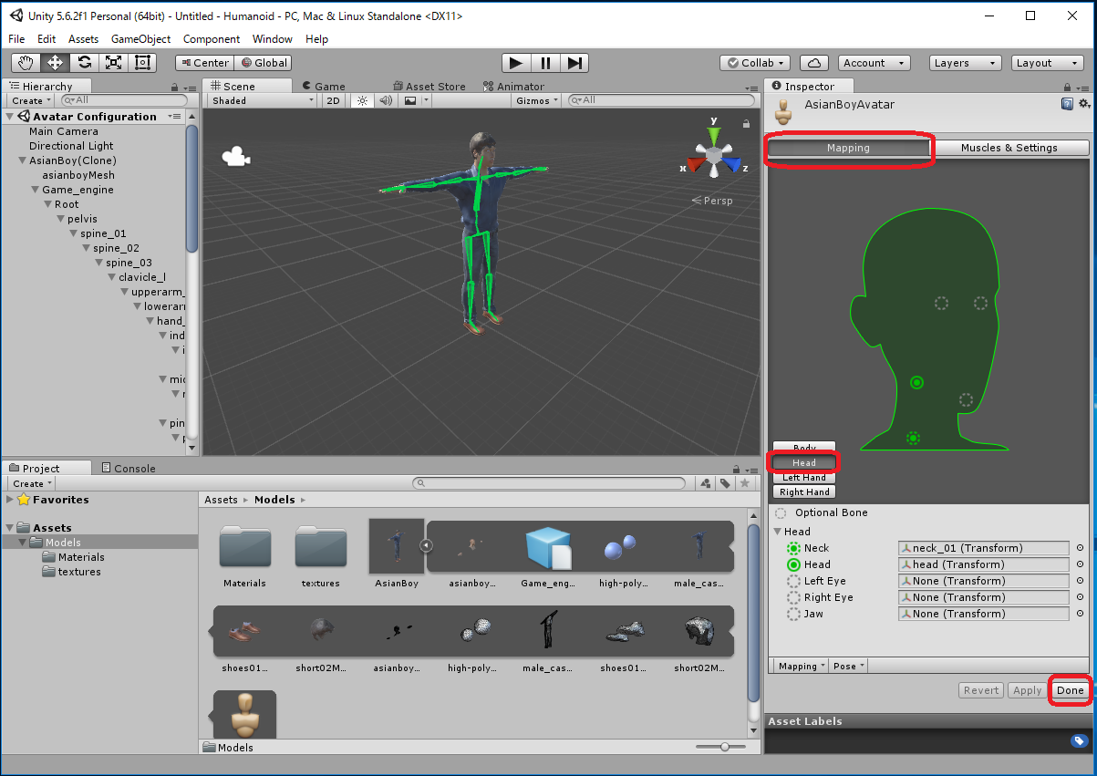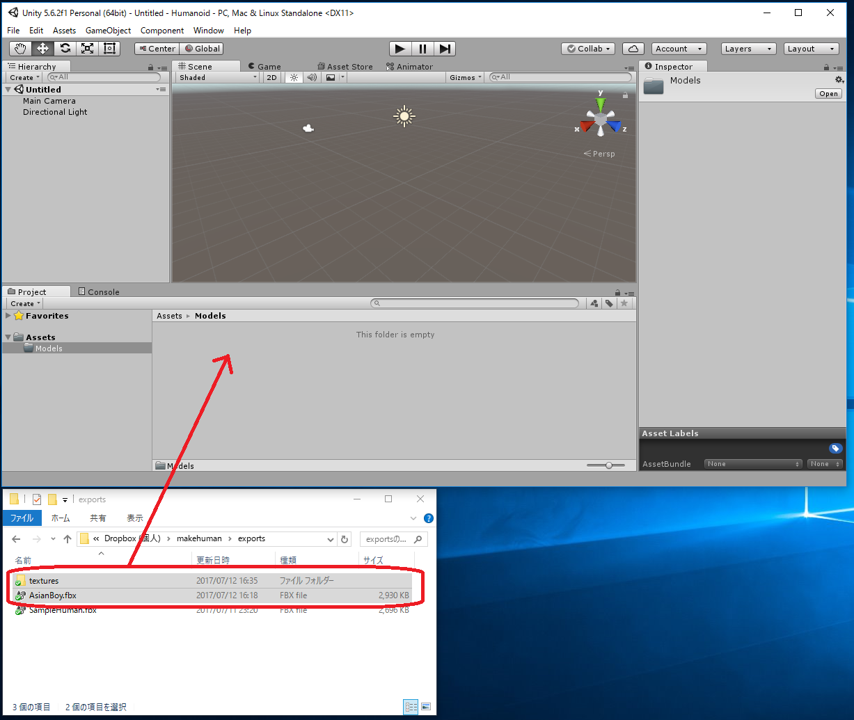 Assets -> Import New Asset... -> AsianBody.fbxから行なってもよいのですが、これだとAsianBoy.fbx に必要なtextureが 自動ではimportされず、モデルが真っ白になってしまいます。 この場合は Assets/Models/Materials/に生成された白いMaterialに対応する Textureを手動でimportしなくてはいけません。