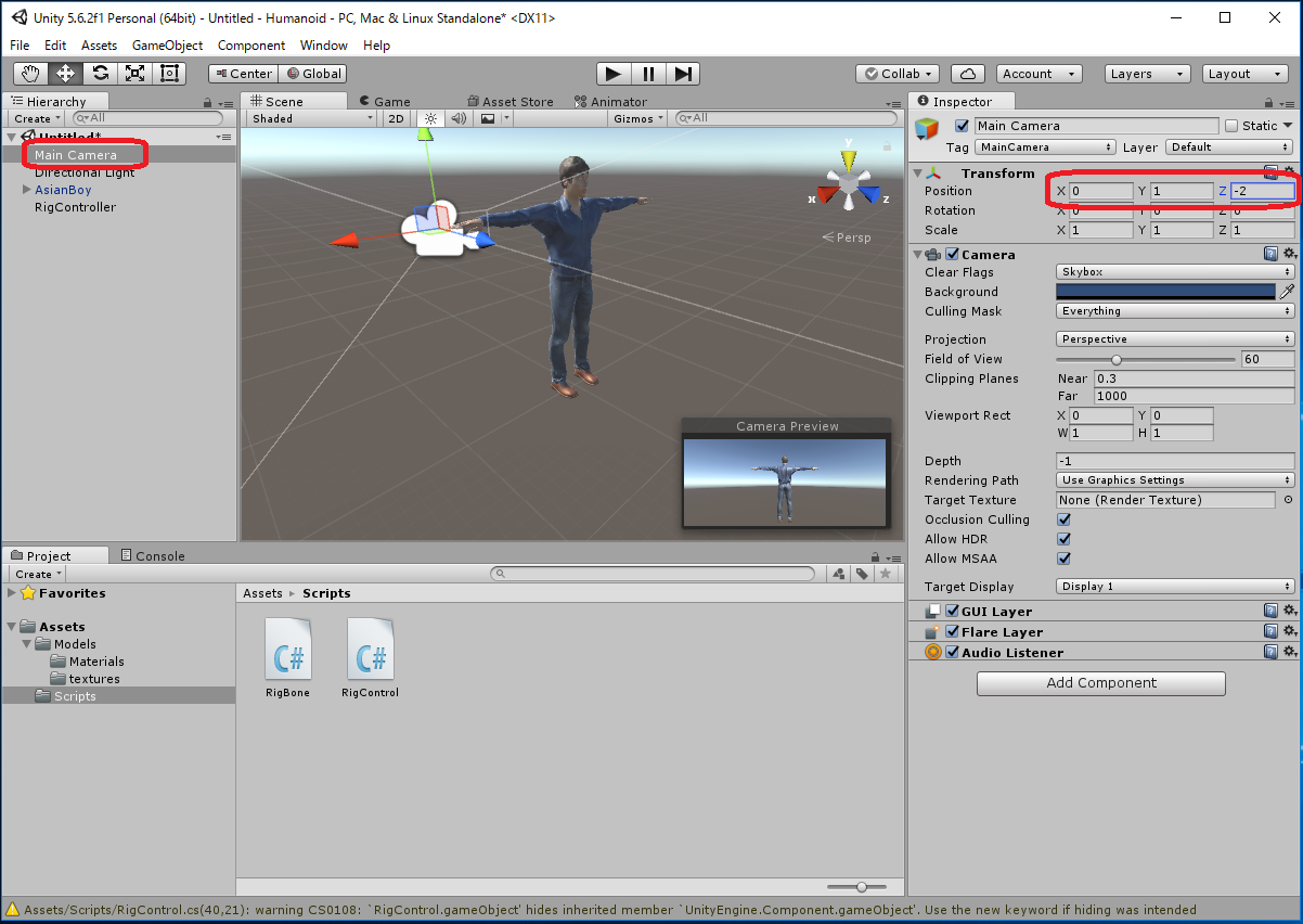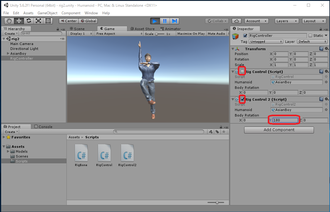 プログラムを実行中にHierarchy ウィンドウで RigController を選択して、 RigController の Inspector ウィンドウ中の "Rig Control 2 (Script)" コンポーネントの BodyRotation を (X,Y,Z)=(0,180,0)にするとカメラ方向を向きます。