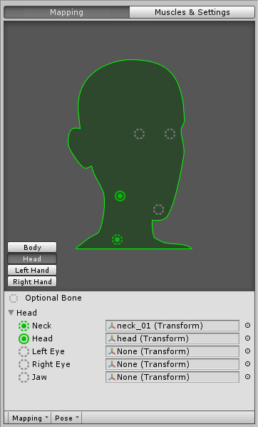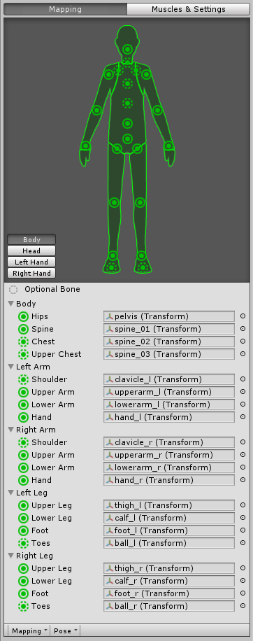 Unity の Humanoid (人型キャラクター)の骨格は階層化されたBoneから構成されています。 Mapping で「実線の外丸は必須Bone」「点線の外丸はオプショナルBone」を表わし、 塗り潰した丸は「このHumanoidにおいて割り当てられているBone」を表わします。