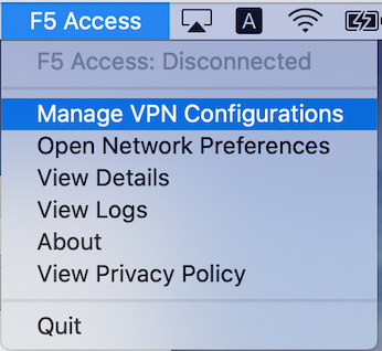 2. Macの画面下の Docker 内の launch pad から F5 access を起動しても、一見何も変らなく見えるが画面右上のメニューに "F5 Access"が表れる。 "F5 Access" から "Manage VPN Configurations" を選択する。