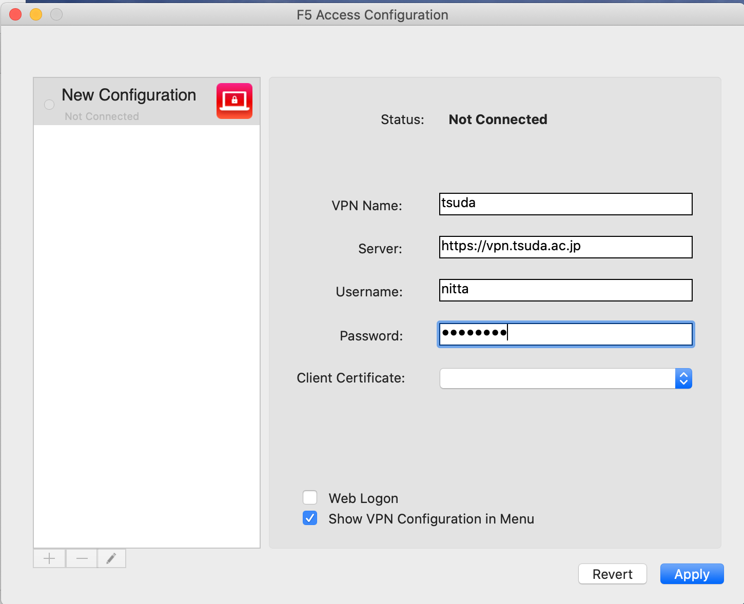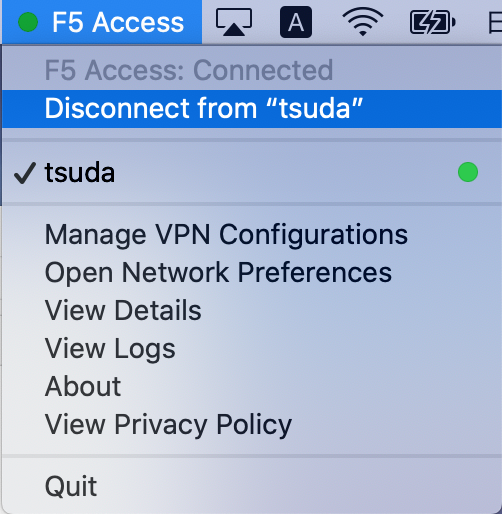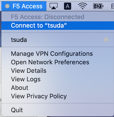 5. 画面右上のメニューバーの "F5 Access" から 「Connect to "tsuda"」 を選択する。