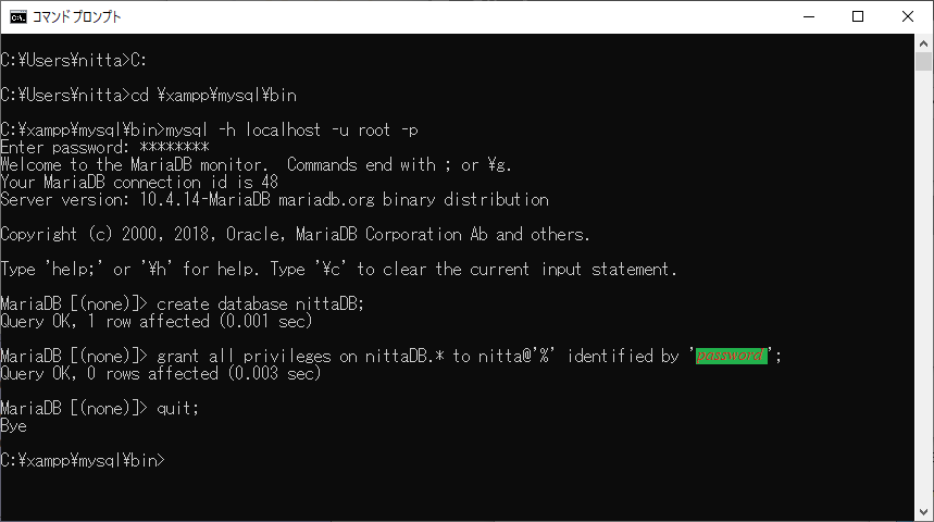 | データベースを作成し、ユーザにアクセス権限を与える |