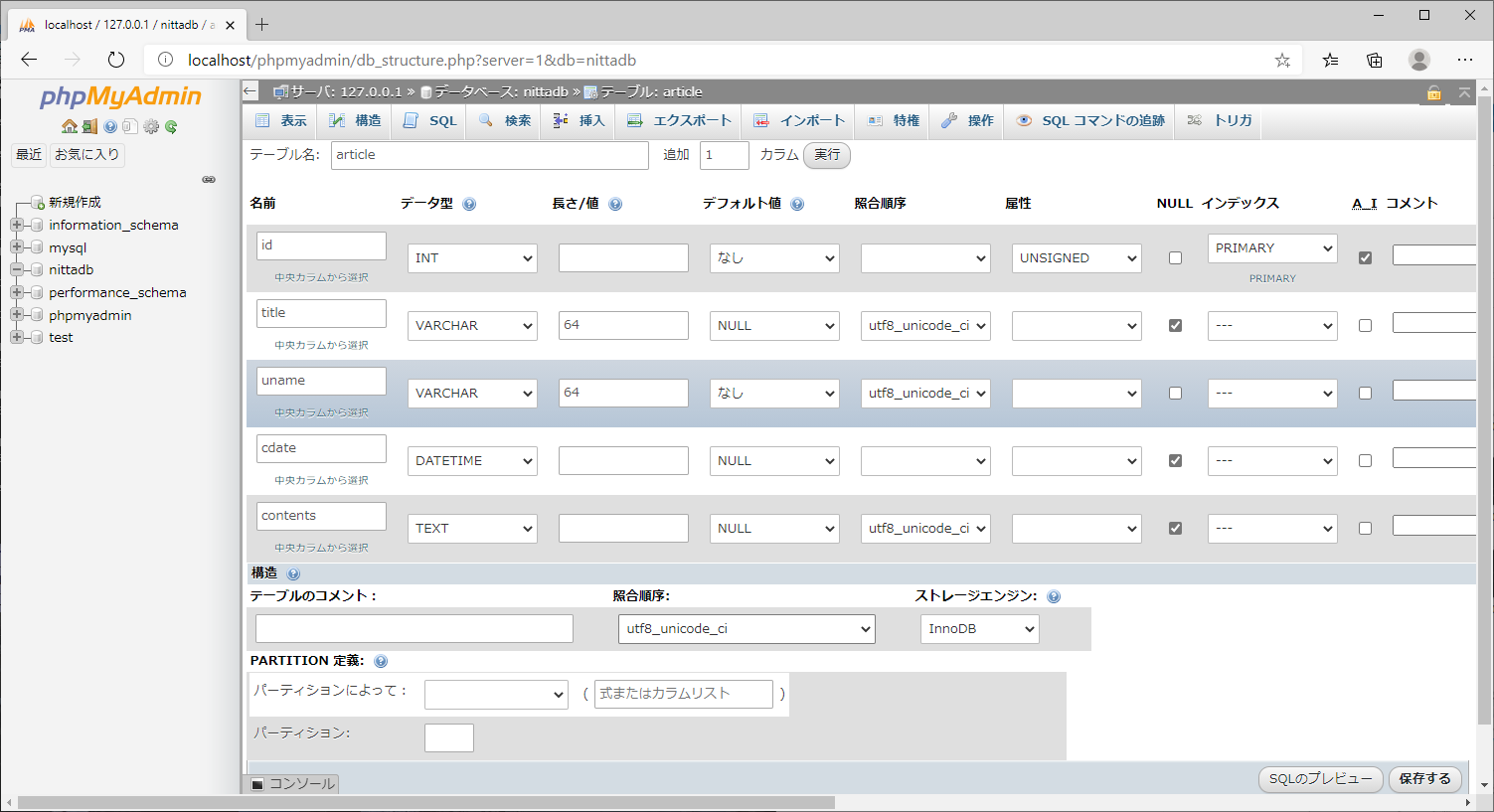フィールド 種別 長さ 照合順序 属性 ヌル その他 Key id INT UNSIGNED not null auto_increment x title VARCHAR 64 utf8_unicode_ci null uname VARCHAR 64 utf8_unicode_ci not null cdate DATETIME null contents text utf8_unicode_ci null下の方にある「照合順序」もutf8_unicode_ciとします。